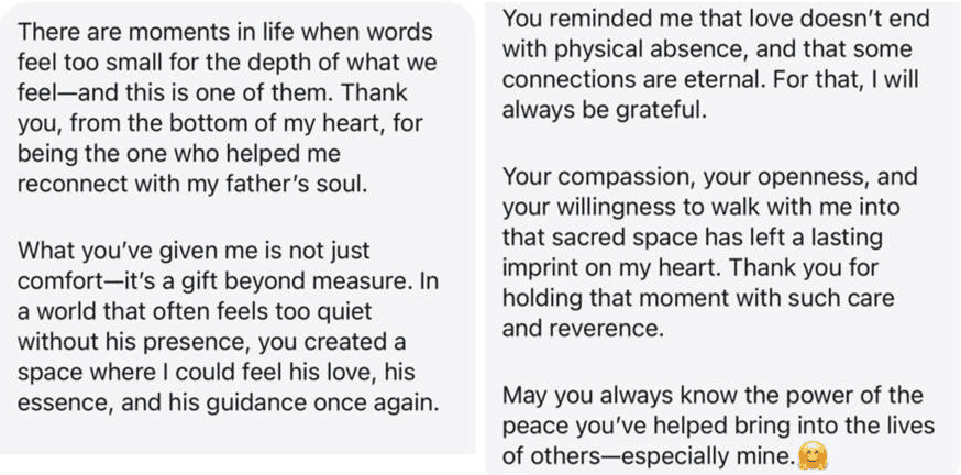 These testimonials are heartfelt reflections from people who have experienced deep emotional, spiritual, and energetic shifts through this healing work. Each story speaks to a personal journey—of release, clarity, renewal, and reconnection with one’s true self. While every path is unique, the common thread is transformation: moments of peace after turmoil, light after heaviness, and a renewed sense of balance and purpose. Shared with gratitude and honesty, these voices offer a glimpse into what becomes possible when healing is approached with trust, intention, and compassion.